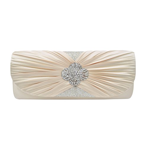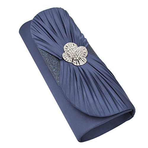 This premium quality evening clutch is both elegant and stylish. Pleated satin fabric front with sparkling crystal rhinestones center. fully lined with magnetic-flap closure and inner wall pocket. Removable hideaway shoulder chain strap with 22" drop. Pretty, functional and versatile. The size is 10.25" (L) x 4" (H) x 2" (W). Elegant design and luxury feel. A must have accessory for the perfect night out.Feature