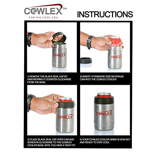 Cowlex is for the cool you and what better way to keep you cool wherever you go than with the Cowlex ultimate drink cooler? This high quality, made to last stainless steel drink cooler can keep your drink at just the right temperatures for hours on end-no matter how hot the day may get or where life may take you. The sealing technology keeps all standard 12 ounce cans and bottles cool without any sweat or residue on the Cowlex. This means no slippery drinks nor annoying ring marks. All you need to do to use this simple but effective Cowlex ultimate drink cooler is to remove the black insert, next, place you can or bottle inside, to finish, all you have to be place the black cover back into the stainless steel, that's it. Enjoy your cool beverage for up to 6 hours without compromising the perfect temperature.Feature