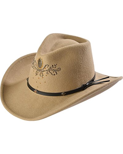 Studio : Master Hatters Publisher : Master Hatters Binding : Apparel Product Description Add serious contemporary cowgirl style to your wardrobe with our Destiny felt cowgirl hat This women's hat is made in the USA of 100% wool. Cowgirl hat boasts a 3 1/4" hat brim and 4 5/8" pinchfront crease hat crown. Breathable Dri-Lex sweatband with bamboo is extremely absorbent and breathable, incredibly soft and comfortable, and it quickly transports and evaporates. Easy sizing: S(6 3/4-6 7/8), M(7-7 1/8), L(7 1/4-7 3/8), XL(7 1/2-7 5/8). Cowboy hat crown height and brim width may vary slightly. 0