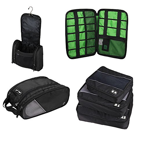 [Description] 6 Piece Bundle that includes 3 packing cubes_ 1 toiletry bag_ 1 shoe bag_ 1 electronic cable bag_ backed by BagSentials Risk Free 100% Satisfaction Guarantee. Strong & Light - Ultra lightweight rip stop nylon with YKK Zippers. These cubes are built to last. Each set is made with durable high quality waterproof rip-stop nylon fabric that resists usual wear and tear. Quality zippers_ high quality easy-pull cords and see through mesh top. Organization at its best - Find items or cloths easily and fast.Quickly organize your bag.Breeze through airport security.Multiple stops Pack and unpack in flash. Pack & Unpack your luggage quickly by taking the cubes from the luggage straight to the drawers or closet and avoid clutter. Perfect Fit - These cubes are designed to fit like a glove into most airline carry-on suitcases_ tote bags_ weekender_ backpacks and duffle bags.A great way to keep organized during those Business Travel_ Camping_ RV_ Cruises and bike Saddlebags. Electronic Cable Bag - Keep those electronic gadgets and cables tangle free. No more searching in the bottom of the bag for loose cables.