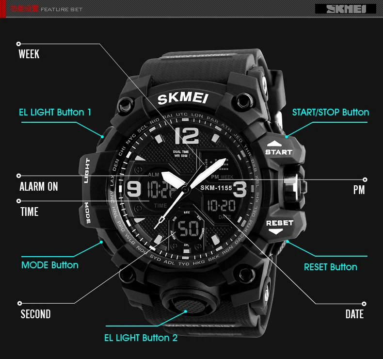 Feature:Alarm,Back Light,Water Resistant,Multiple Time Zone,Chronograph,Shock Resistant,Stop Watch,Complete Calendar,Auto Date,LED display