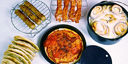 Includes 7" baking pan, 8" pie/pizza pan, insert rack, insert rack w/ 3 skewers, toasting/warming rack, silicone pot holder