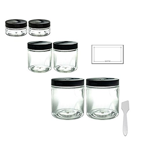 - Includes (6 Pack) 2 - 2 oz, 2 - 4 oz, 2 - 8 oz Clear PET Plastic (BPA Free) Refillable Travel Jars Set + Spatulas and Labels Optional Use