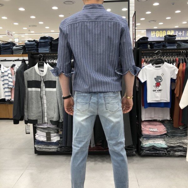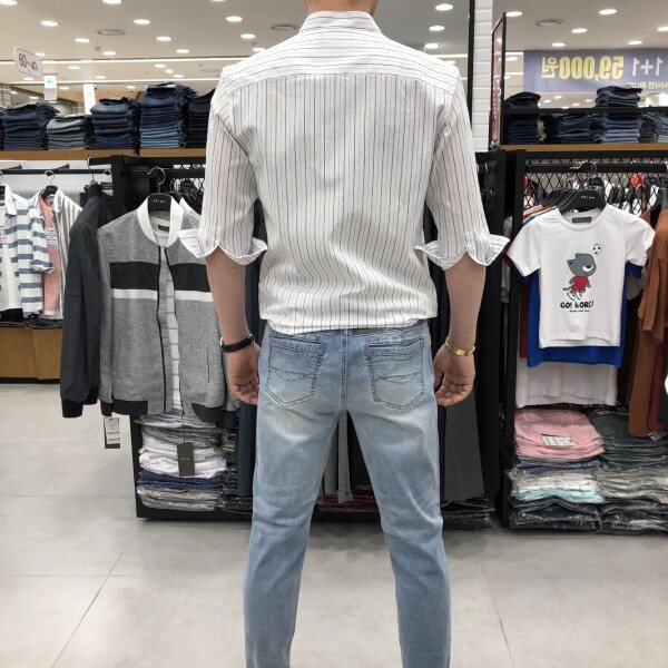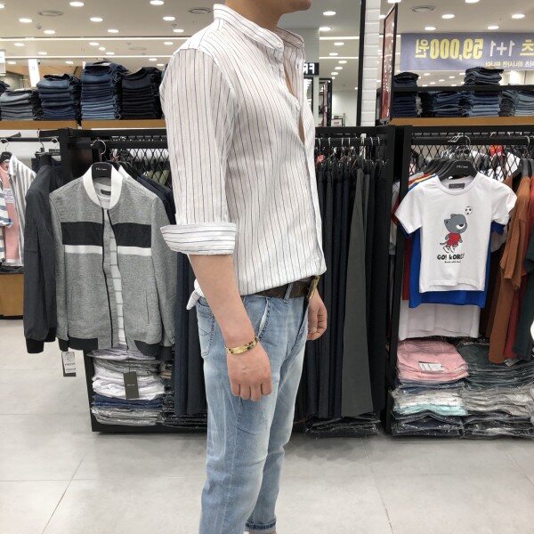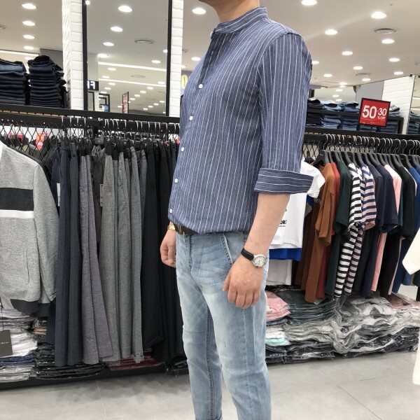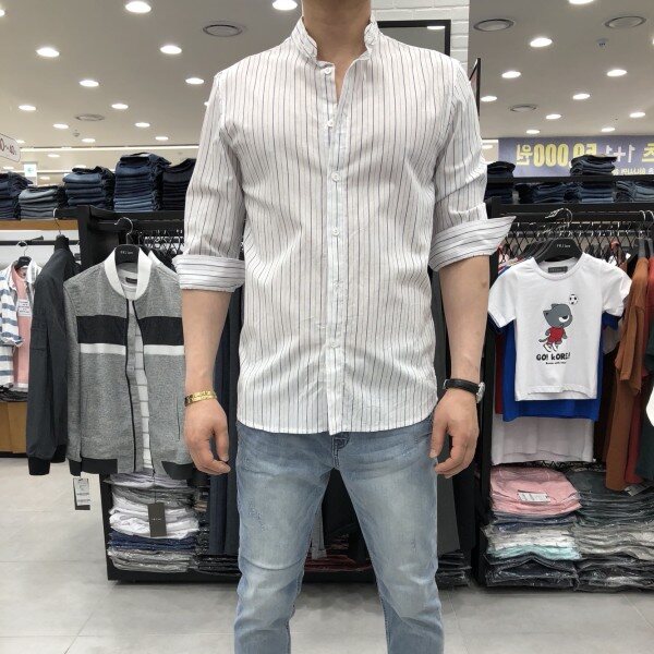 2018년 여름 신상품으로 출시된 7부형 셔츠상품으로 세로 스트라이프로 보인트를준 세련되고 깔끔하게 입기좋은 디자인입니다.남성모델 키178cm, 몸무게70kg으로 네이비,화이트순으로 100사이즈착용하였습니다.