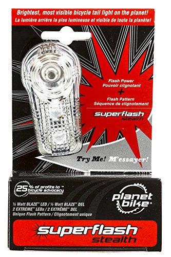 Amazon.com Product Description Whether you're biking home from school or on a long training ride, the Planet Bike Blinky Superflash rear bicycle light will keep you visible to passing cars, pedestrians, and other cyclists. The Blinky Superflash is equipped with a 1/2-watt Blaze red LED and two eXtreme LEDs, which combine to produce a unique, eye-catching red flash pattern that's visible for up to 1 mile. The light is also built for long-term use, with an ultra-compact vertical design that's weatherproof, lightweight, and durable. Best of all, the Blinky Superflash attaches to almost any bike, with bike mounts and a clip mount included in the package. Offering both flashing red and steady red modes, the Blinky Superflash runs for up to 100 hours on two AAA batteries (included) and carries a limited lifetime warranty. About Planet Bike In November of 1996, Planet Bike was founded in Madison, Wisconsin. In many ways, Planet Bike began as a social experiment that dedicated itself to doing business in a different way. Instead of being just another company that develops and sells products with profit as its end goal, Planet Bike wanted to help bring about positive change for people, their communities, and the environment. Despite being a simple machine, the people at Planet Bike have always believed that the bicycle has great potential to help improve the world and the lives of the people in it. From the start, they have embraced an alternative corporate purpose which seeks to help get more people on bicycles by making communities friendlier places for the self-propelled. By donating 25% of company profits to causes that promote and facilitate bicycle usage, Planet Bike hopes to make an impact. Social experiments aside, Planet Bike was born from the heart of a cyclist with a goal of making innovative, high quality, and practical bicycle accessories. Simply put, they strive to design and develop the best bicycle products in the world. In the company's short ten year history, they have made important product innovations within the bicycle industry. Advancements include the 4-line computer which is now a standard in the industry and the world's first self-contained HID light. Not bad for a company that ten years ago started as a one man operation. Today, while still a small company, Planet Bike continues to evolve and improve their product line with the goal of always striving to build accessories that make it easier for people to ride their bikes. Since 1996, Planet Bike's financial support of the grassroots bicycle movement has totaled $500,000. By 2010, they have made a goal to donate $1 million to organizations that are dedicated to making America a friendlier place for cyclists.