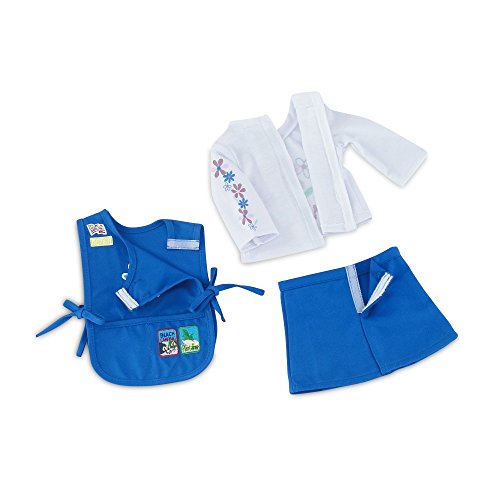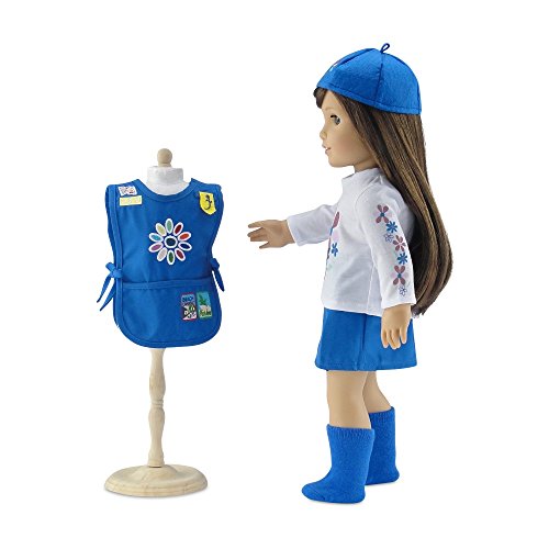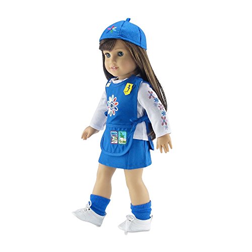 Authentic looking and oh so amazing Daisy Girl Scout-inspired 18" doll outfit! Take your doll with you to your next scouting event wearing this super cool uniform, including bright blue pleated skirt and matching tunic with 5 colorful embroidered patches and removable insignia tab! But that's not all! This amazing outfit includes a one of a kind long sleeved tee-shirt with daisy flowers printed on the front and frolicking up one sleeve, a bright blue matching beanie style hat with embroidered flower, and matching blue socks. This awesome doll outfit comes packaged in our special pink Emily Rose gift box and is a special addition to your 18 inch doll's wardrobe! *Doll Not Included* *Doll Shoes Not Included* *Doll Clothes Stand Not Included*Feature