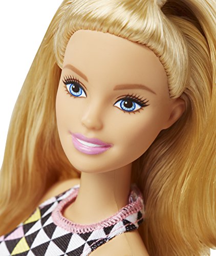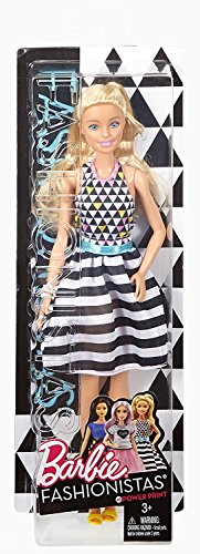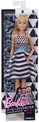 - Barbie Fashionistas doll wears a bold dress with colorful graphic print on the bodice, black and white stripes on the skirt and blue sash