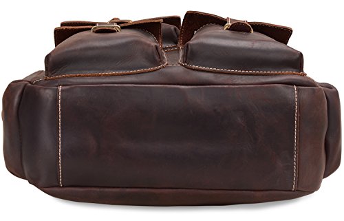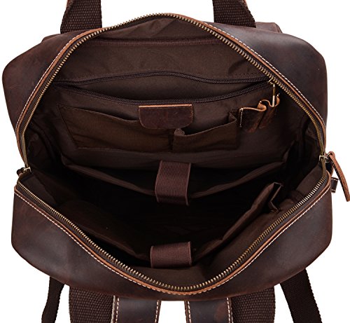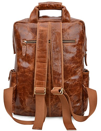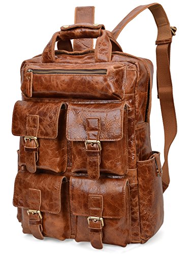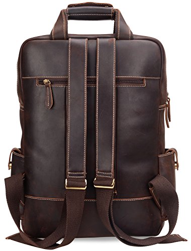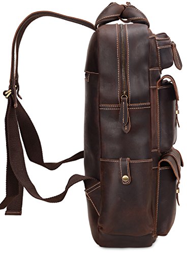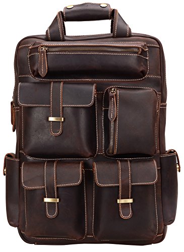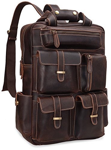 -. Feature : 100% GENUINE LEATHER: Made by top layer leather in outside; Dimensions: (L)12" x (H)17.5" x (W)4.5"; / LARGE CAPACITY: Exterior: 5* front pockets; 1* rear zipper pocket, 2* side pockets,1 large main zipper pocket: 2*slip pocket & 2* pen slots, 1 *laptop pocket, 1*Ipad pocket; / DURABLE&PRACTICAL BACKPACK: Can fit up to 17 inch laptop; The iPad pocket can fit up to 13 inch Ipad; You can put tablet PC, A4 magazine, textbooks, clothing, wallet, phone, etc; / MULTIFUNCTION: Suitable for business trip, casual, traveling, mountaineer, outdoor, sports, hiking, camping, and other daily use; / GOOD CUSTOMER SERVICE: Have 1-YEAR WARRANTY. Any problems with your bag, please contact our world-class, friendly customer support team for quick solutions by contacting us through Amazon;