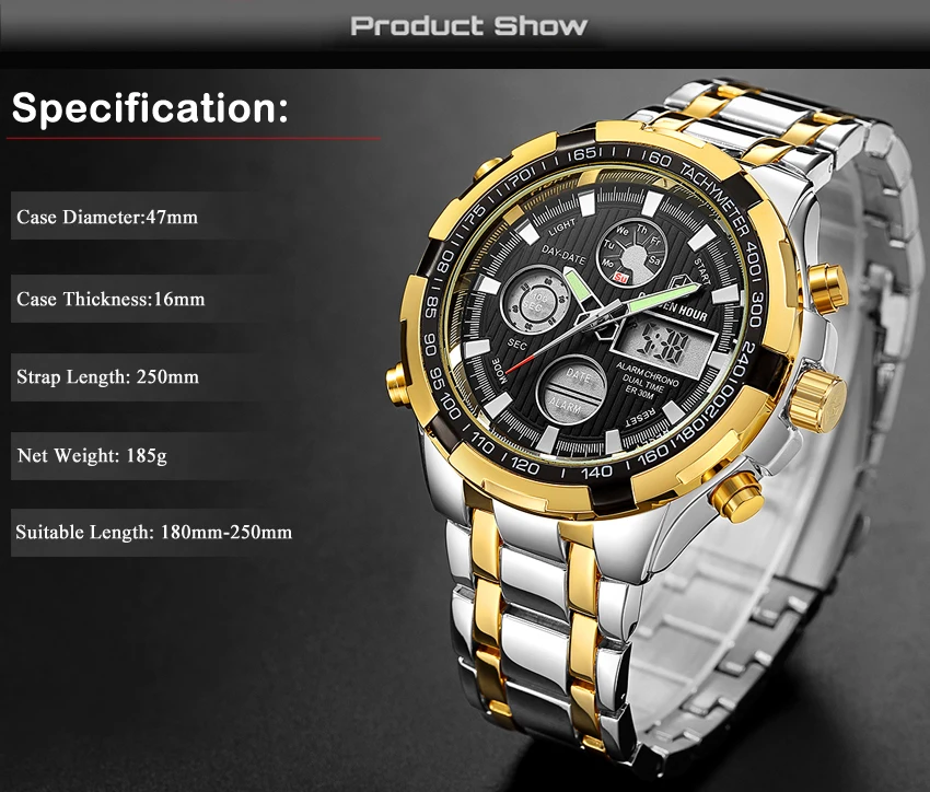 Feature:Stop Watch,Back Light,LED display,Complete Calendar,Perpetual Calendar,Week Display