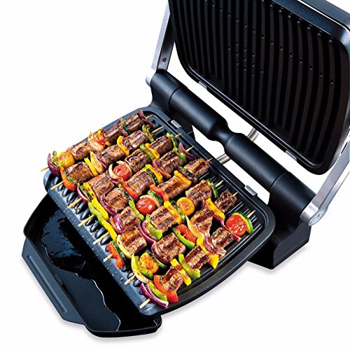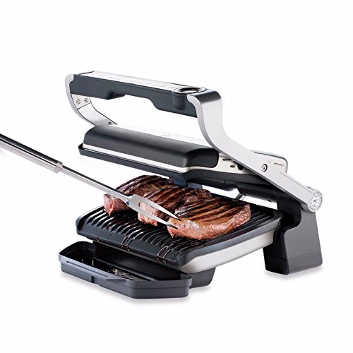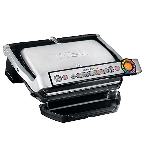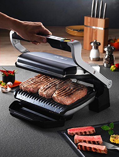 Opti Grill for optimal cooking! Meet Opti Grill, our ultimate innovation. Its "Automatic Sensor Cooking" technology immediately detects the number of items placed on the grill and their thickness in order to adjust the temperature and cooking time automatically . An indicator light allows cooking progress to be monitored directly: Blue then green at the start of cooking, then yellow when the food is rare, orange when it is medium and red if you like your food well done: Adjusts to your needs, lift up the lid to pick up your meat when it's ready and leave the rest to carry on cooking. 6 cooking programs (Red meat, Burger, Poultry, Sandwich, Sausage, Fish) to automatically adapt the temperature to each type of food and cook it perfectly as required. 2 cooking modes: one for frozen food and a manual mode so you can cook anything the way you want. 600cm2 cooking surface (capacity 2 to 4 people) made with non-stick die-cast aluminum plates. Large juice tray and plates with an angle of 7 Degree to ensure cooking juices run off.Feature