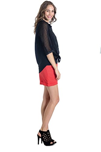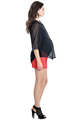 Binding : Apparel Product Description The Amy Top is a button-down lightweight top with three-quarter sleeves. Menswear inspired fabric combined with very feminine touches. It features a tapered hemline that can be worn loose or tied in a cute knot. Wear it open or closed, pregnant or not...this shirt will be in your wardrobe for years to come! Sizing (We recommend that you choose your pre-pregnancy size) XS=2-4 S=4-6 M=8-10 L=10-12 XL=12-14 Brown plaid has lime, olive and orange in the pattern with a solid olive back panel Black and white houndstooth has fleck of gold in the weave and pleather trim on the collar, cuff and button panel. Cotton, Polyester/Spandex Hand wash or machine wash cold on gentle cycle Made in USA 0