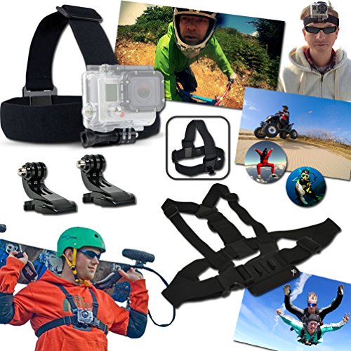 The SKI / SKIING and Snowboarding Accessories Kit Includes an Adjustable HEAD STRAP / Headstrap Mount Designed to fit all sizes + Chest Strap Mount that can be worn either directly over a body or over clothes + 2 J-Hooks.