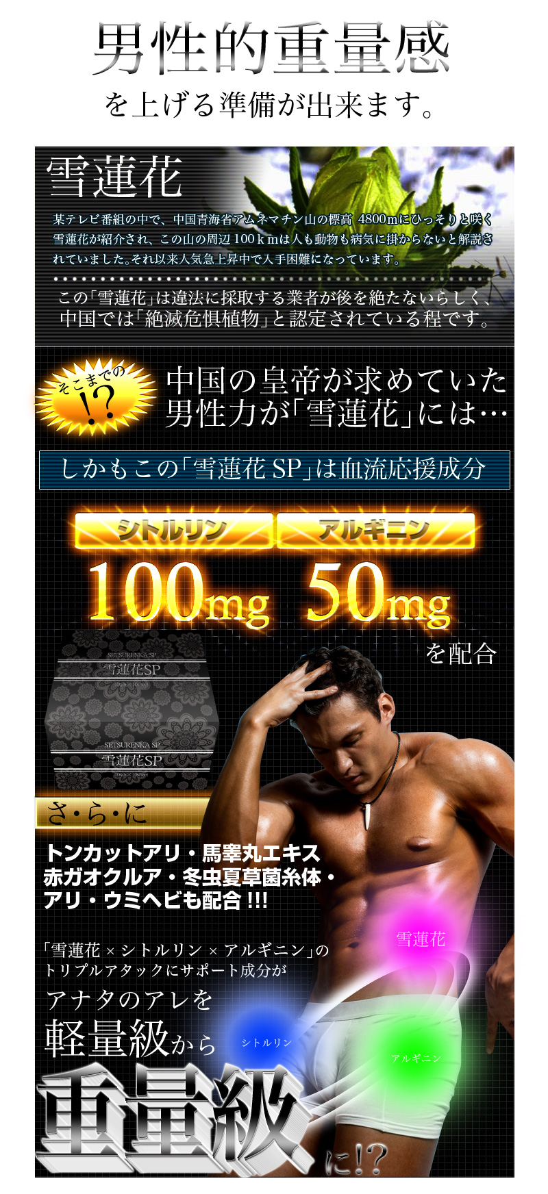 原材料 雪蓮花エキス、L-シトルリン、トンカットアリ末、馬睾丸エキス、アカガウクルア、冬虫夏草菌糸体、蟻粉末、ウミヘビエキス、ゼラチン(豚由来)、L-アルギニン、トレハロース、セルロース、活性炭、ステアリン酸カルシウム、微粒酸化ケイ素