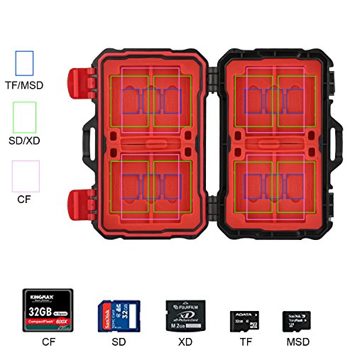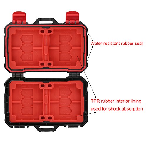 -. Feature : Unique design: Card box with convex design,you can comfortably grip the cartridge;and Cartridge lock to prevent the memory card is lost / Snug fit - Molded specifically to hold Micro and Standard SD Cards securely / Stability: The cards store insert drawers securely in the hard rubber, Each slot is strictly tailored to fit the card,Extremely stable / Application : Hard protective shell, water-resistant and robust memory cards protection box made of polycarbonate.Fits for SD card, Micro SD card, CF cards / High capacity : 4 slots for CF card ,8 slots for SD cards and 12 slots for Micro SD memory card