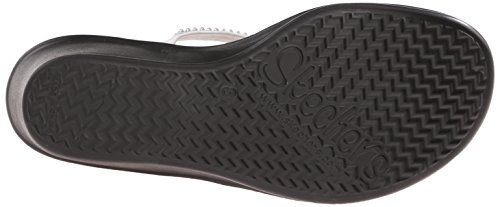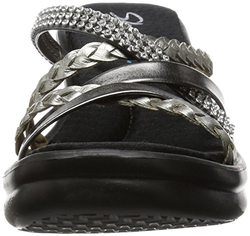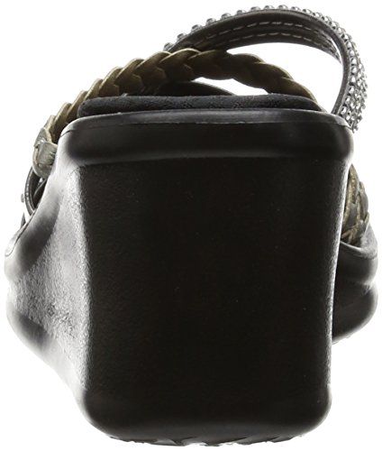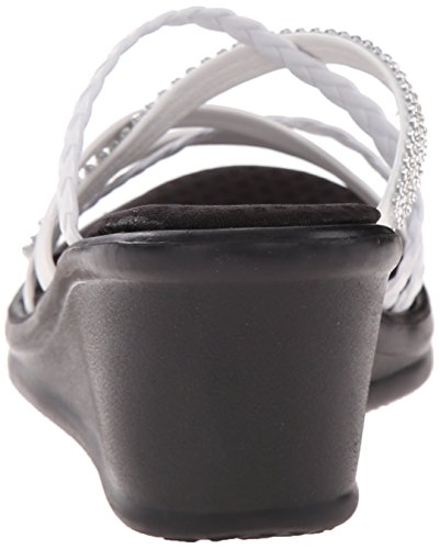 Slip-on wedge sandal featuring mixed-media crisscross straps and memory foam insole