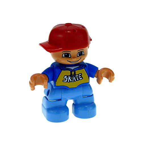 -. Title : LEGO Duplo Figure LEGO Ville, Child Boy, Medium Blue Legs, Blue Top with 'SKATE' Pattern, Red Cap (x1 Loose)