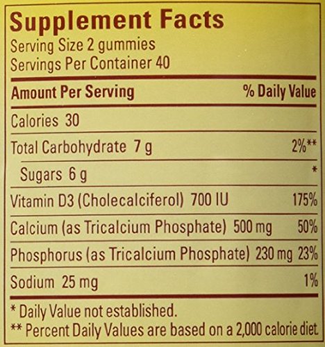 -. Feature : Natural fruit flavors / Adult gummies / Calcium / Bone support with vitamin D3 / Cherry, Orange & Strawberry