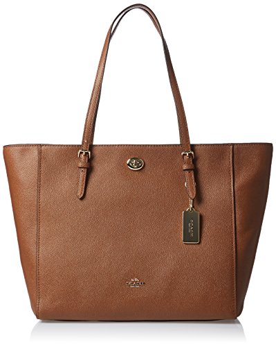 -. Feature : Color/material: saddle leather / Exterior design details: gold-tone hardware / Interior design details: fabric lining, interior pockets / Measures 12.5in wide x 11in high x 5.5in deep / Top handles drop 9in