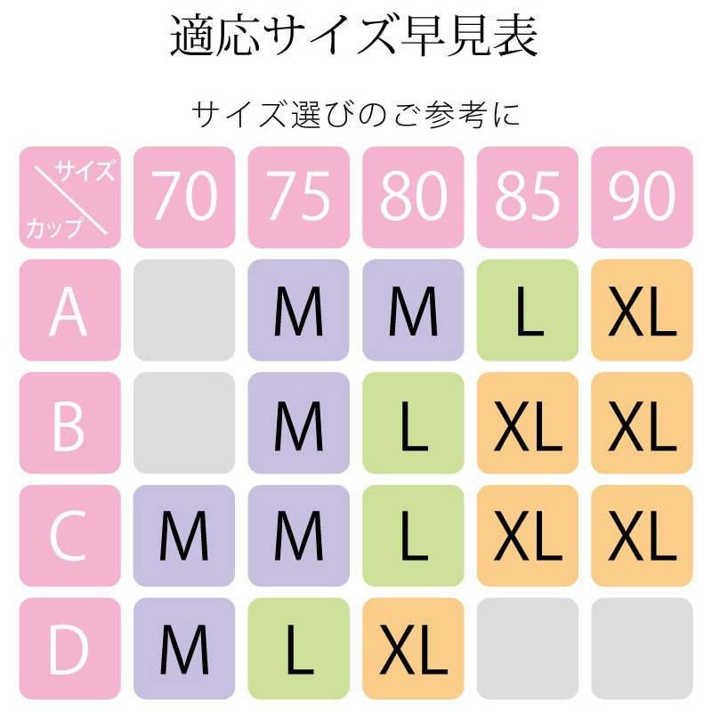 | サイズ | (M) 70C 70D 75A 75B 75C 80A (L) 75D、80B、80C、85A (XL) 80D、85B、85C、85D、90A、90B、90C | |