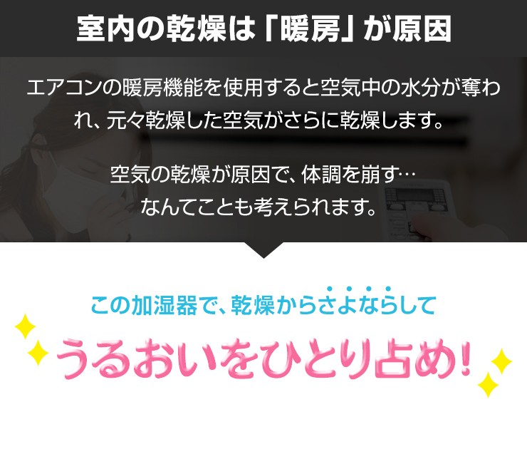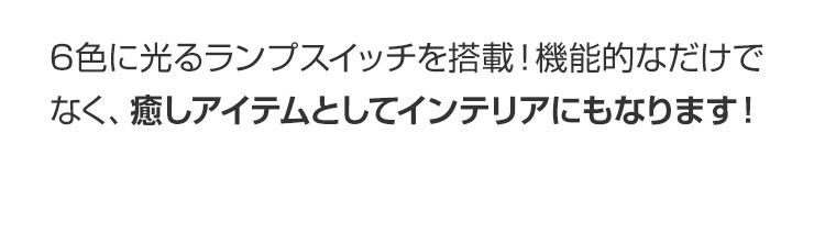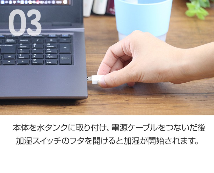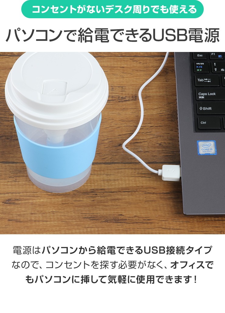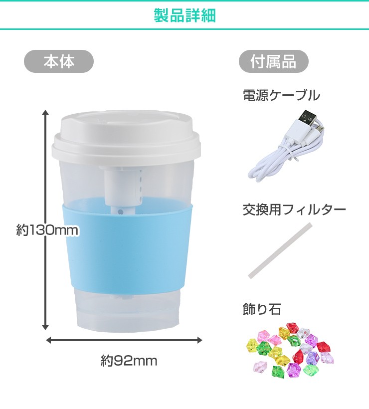 最大約8時間も潤いが続く、コンパクトな卓上加湿器が登場!デスクや寝室に置いて、今年の冬は「うるおいをひとり占め!●最大8時間加湿で、コンパクトなのにしっかり加湿します!●触れても熱くない、超音波式で安心・安全●パソコンで給電できるUSB電源でデスクでも簡単に加湿!●透明タンクで水の残量がひと目でわかる!●6色に光るランプ機能付きでインテリアとしても楽しめる!●1日8時間毎日使っても、1ヶ月の電気代が約10円と財布に優しい!製品仕様 定格電圧:DC5V電流:500mAh消費電力:1.5W最大加湿量:最大約35ml/h適用床面積(目安):約4-5平方メートル (2.58-3.22畳)※最大加湿量で連続加湿した場合を示しています加湿時間:約8時間タンク容量:300mlサイズ:約H130×W92×D92mm重さ:約95g材質:ABS付属品:電源ケーブル×1、交換用フィルター×1、飾り石×1お買い上げから6ヵ月間保証デジキン