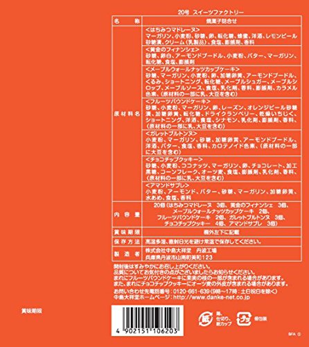 原材料:<はちみつマドレーヌ>マーガリン、小麦粉、砂糖、卵、転化糖、蜂蜜、洋酒、レモンピール砂糖漬、クリーム(乳製品)、食塩、膨脹剤、香料<黄金のフィナンシェ>砂糖、卵白、アーモンドプードル、小麦粉、バター、マーガリン、転化糖、食塩、膨脹剤<メープルウォールナッツカップケーキ>砂糖、マーガリン、小麦粉、卵、加糖卵黄、アーモンドプードル、くるみ、ショートニング、転化糖、メープルシュガー、メープルシロップ、メープルソース、食塩、乳化剤、香料、膨脹剤、カラメル色素、(原材料の一部に乳、大豆を含む)<フルーツパウンドケーキ>砂糖、小麦粉、マーガリン、卵、レーズン、オレンジピール砂糖漬、加糖卵黄、転化糖、ドライクランベリー、乾燥いちじく、ショートニング、洋酒、食塩、シナモン、乳化剤、膨脹剤、香料(原材料の一部に乳、大豆を含む)<ガレットブルトンヌ>小麦粉、マーガリン、砂糖、加糖卵黄、アーモンドプードル、洋酒、バター、食塩、香料、カロテノイド色素、(原材料の一部に大豆を含む)<チョコチップクッキー>砂糖、小麦粉、ココナッツ、マーガリン、卵、チョコレート、加工黒糖、コーンフレーク、オーツ麦、食塩、膨脹剤、乳化剤、香料、(原材料の一部に乳、大豆を含む)<アマンドサブレ>小麦粉、アーモンド、バター、砂糖、マーガリン、加糖卵黄、水あめ、食塩、香料