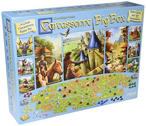 Released to critical acclaim in 2000, Carcassonne has long captivated audiences with its simple yet engaging gameplay. Now you can experience the best the 2001 Spiel des Jahres winner has to offer. The 2017 version of the Carcassonne big box combines the base game along with eleven of its expansions, making it the perfect starter set for anyone who wants to play this bestselling game with as much variety as possible. Including the inns & cathedrals, traders & builders, the Abbot, the River, the flying machines, the ferries, the messengers, the gold mines, mage & witch, the robbers, and the crop circles expansions, the Carcassonne big box includes more than 150 tiles and seven different types of Meeple.Feature
