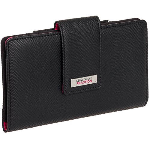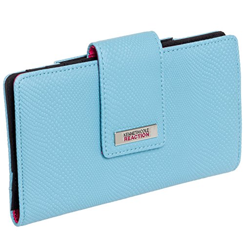 Stop running out of room in your wallet with this Tab Utility Clutch with Mirror by Kenneth Cole Reaction. This spacious clutch wallet features 12 credit card slots, 3 zipper pockets, 3 bill slip pockets, and 2 ID windows. For an added convenience a mirror & ID window has been placed on the outside of this wallet for quick and easy access. All of this is kept safe and secure with snap closures. Use this as either a spacious wallet or clutch making this extremely versatile. Made from synthetic leather this clutch features a 2-tone contrasting interior that adds the perfect touch to finish this wallet off. Measures 7.5" x 4.5" x 1.25" when closed.