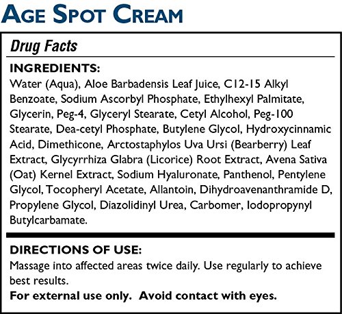 -. Feature : LOOK YOUNGER FAST: Do age spots on your skin make you appear older than you really are? Now you can fade age spots and reclaim your youthful skin tone in just 1 month! / RENEW & REFRESH YOUR SKIN: This formula of natural botanicals fade age spots, liver spots, freckles, and other age-associated discolorations. / SOOTHING CREAM: This natural, unscented formula can be used on your face, hands, chest or other affected areas. Non-greasy formula absorbs completely and will not stain clothes. / SAFE & NATURAL FORMULA: Made Proudly in the USA with natural ingredients and no harsh chemicals / DIRECTIONS: Massage into affected areas twice daily. Use regularly to achieve best results. For external use only. Avoid contact with eyes.