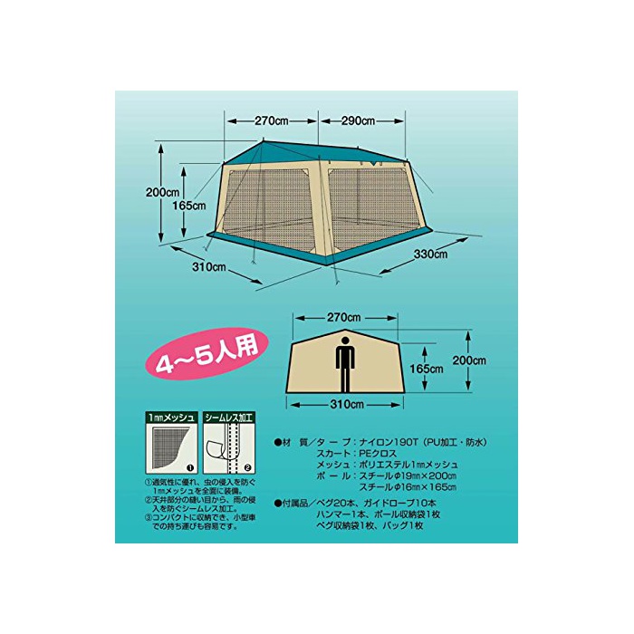 소재 : 타프/나일론190T(PU가공 방수)고, 스커트/PE크로스,메쉬/폴리에스텔1mm메쉬,폴/스틸경19mm×200cm,경16mm×165cm