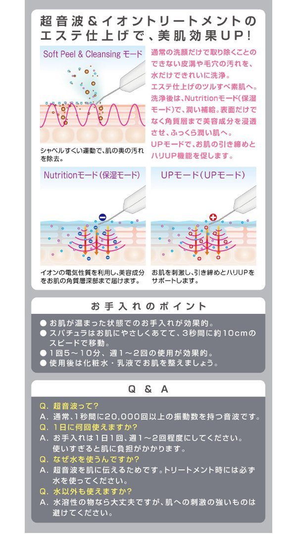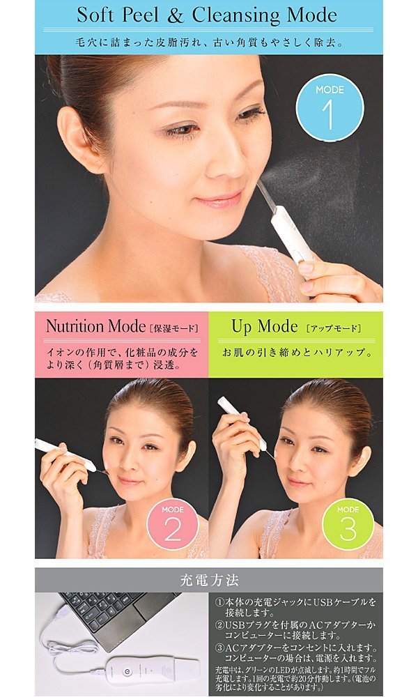 商品サイズ (幅×奥行×高さ) :60x30x160 原産国:大韓民国 内容量:●セット内容:本体、USB充電ケーブル、充電アダプター 材質:●主材質:ABS樹脂 カロリー:●使用電池:リチウムポリマー電池●充電時間:約1時間(約20分の使用が可能)●超音波周波数:29kHz●定格電圧・電流:DC5V500mA●消費電力:約2.5W