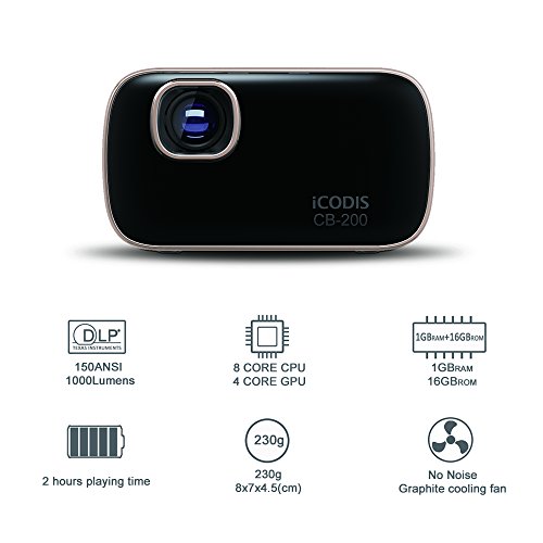 -. Title : iCODIS CB-200 Pico Mobile Projector, 30,000-hour bulb life, 1000 Lumen,WIFI DLP Portable Mini Pocket Size Projectors, Octacore Cortex A7