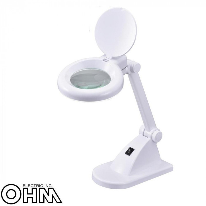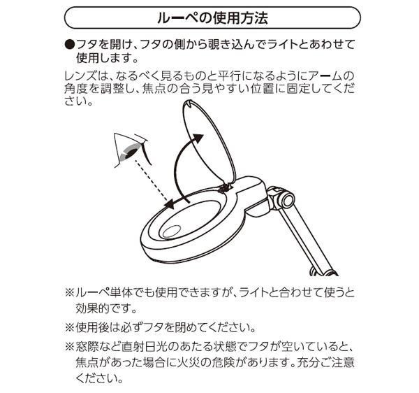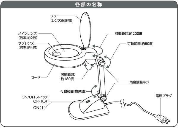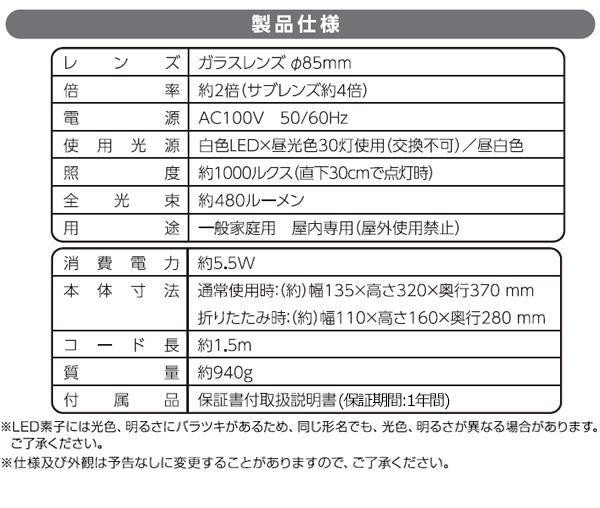 | 拡大倍率約2倍(サブレンズ約4倍)のルーペを搭載したLEDスタンドライトです。LED30灯を環状に配列しているので、手元を周囲から明るく照らして影を作りません。未使用時は折りたたんで収納できます。 |