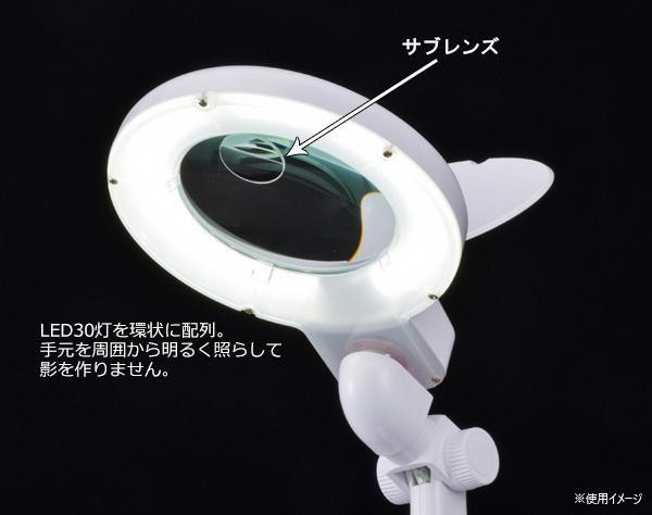 拡大倍率約2倍(サブレンズ約4倍)のルーペを搭載したLEDスタンドライトです。LED30灯を環状に配列しているので、手元を周囲から明るく照らして影を作りません。未使用時は折りたたんで収納できます。 |
