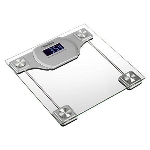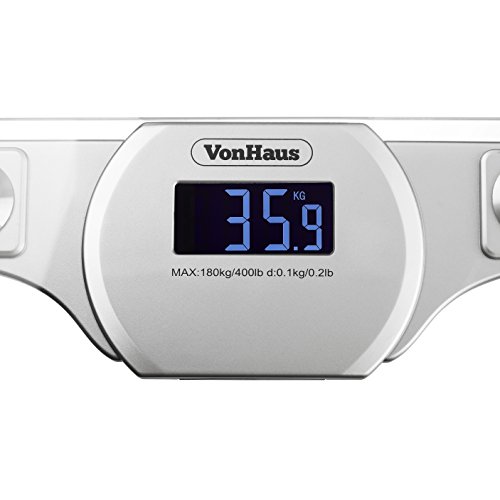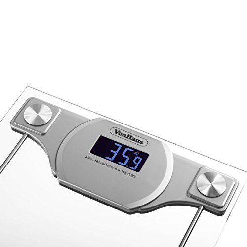 -. Brand : VonHaus -. Color : Silver -. EAN : 5060351495301 -. Feature : Units in Pounds or Kilograms - Max Capacity: 400lb/180Kg. Graduation: 0.2lb/100g. / Stylish & sleek VonHaus clear glass bathroom scale. The glass is 0.24in tempered for extra strength and safety. / A great addition to the bathroom, and pleasing to the eye with an easy-to-read LCD display! It also has a low battery and an over load indication. / With Step On, Auto Zero and Auto Power Off functions. The VonHaus weighing scale is powered by 2 x AAA 1.5V batteries (not included). / Premium digital bathroom scale with high accuracy and sleek design, suitable for any bathroom. -. Label : Designer Habitat Ltd -. Manufacturer : Designer Habitat Ltd -. MPN : 07/334USA -. NumberOfItems : 1 -. PackageQuantity : 1 -. PartNumber : 07/334USA -. ProductGroup : Home -. ProductTypeName : HOME_BED_AND_BATH -. Publisher : Designer Habitat Ltd -. Studio : Designer Habitat Ltd -. Title : VonHaus Digital Bathroom Scale: Glass/Silver Body Weight Scale w/ LCD Display, 400lbs/180kg Capacity