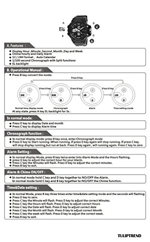 Studio : TULIPTREND Publisher : TULIPTREND Binding : Watch Product Description Display: hour, minute, second, month, day and week EL back light Stopwatch function Chime on every Battery life: in the normal situations can be using 18 months NOTE: Please do NOT press any buttons in water when swiming or diving Please be free to contact us if you have any problem with this watch 0
