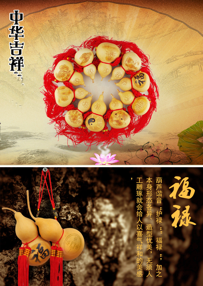 In the five year history of the Chinese nation, the gourd is considered by many national human ancestor worship. In the myths and stories, always with the gods and heroes gourd as partners, it is considered to be brought to mankind Fluke, exorcism evil spirit of things. Many gods, geniuses are also toting Yaoxuan gourd or calabash, such as the Eight Immortals in the torrent, the oldest Antarctic Weng, Monk Ji Gong and so on. Therefore, since ancient times gourd "Fluke auspicious", "health and longevity," a symbol, but also protect the yield residential nursing home.