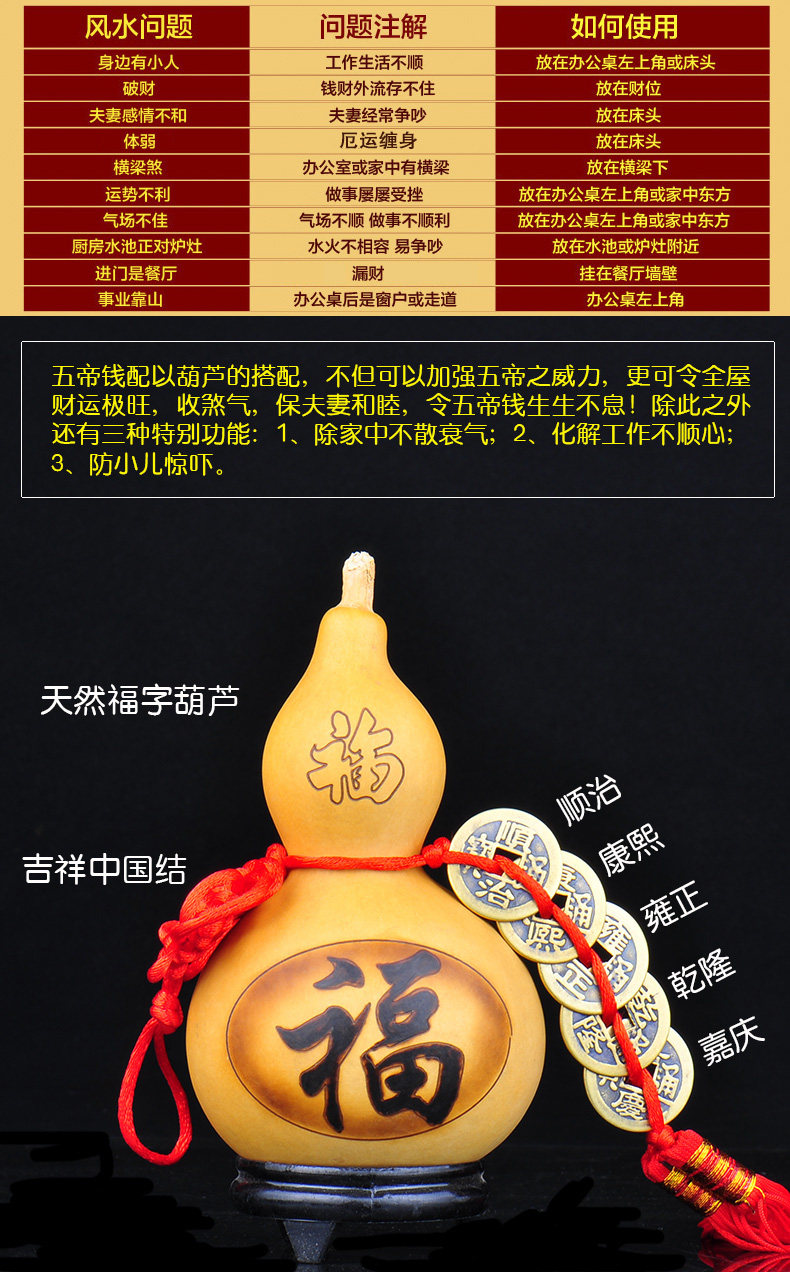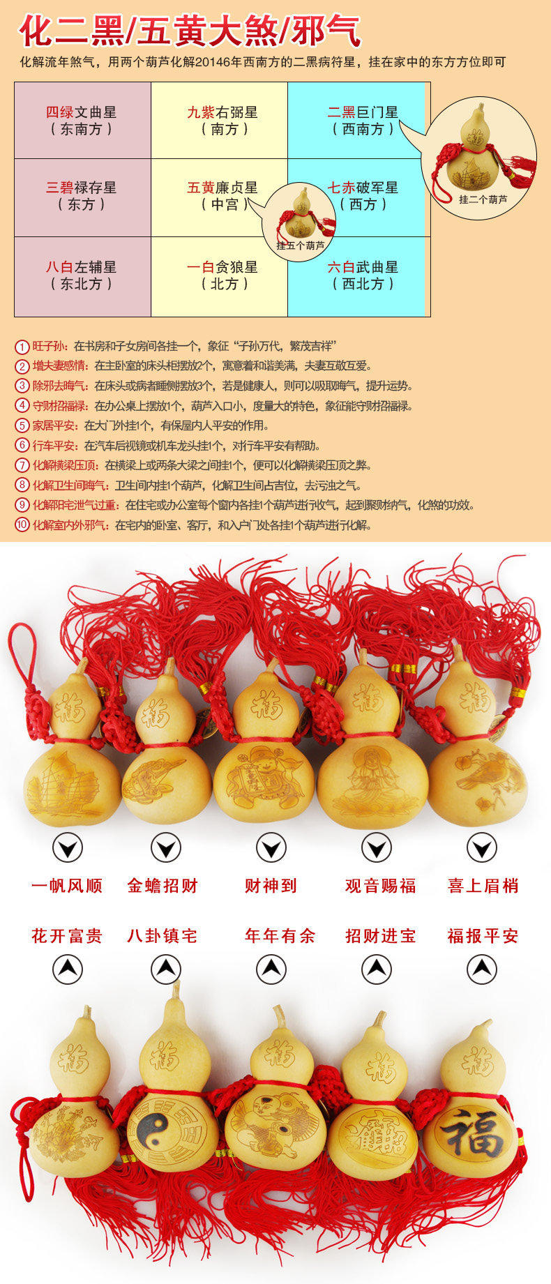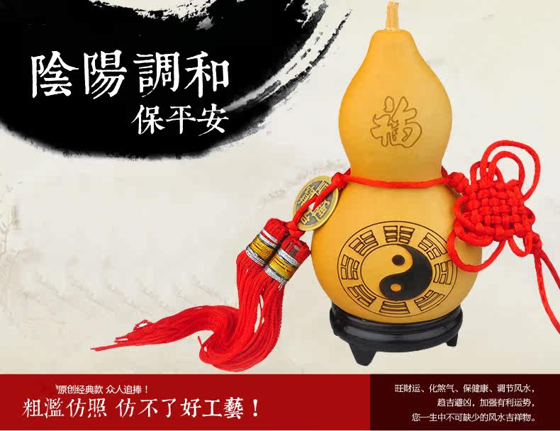 Gourd role is very broad, but also the role of the mascot of feng shui best feng shui supplies the most complete, the preferred home ornaments belonging to the gourd family symbolic prosperous, happy, rich meaning, financial position can be placed in the house for the family wealth has help, placed at the bedside for couples feelings of harmony have some benefits, but also a symbol of peace gourd, smooth, smug; and there are many associated with the pharmaceutical companies to hoist the flag, so there gourd good turn deserves another symbolic meaning.