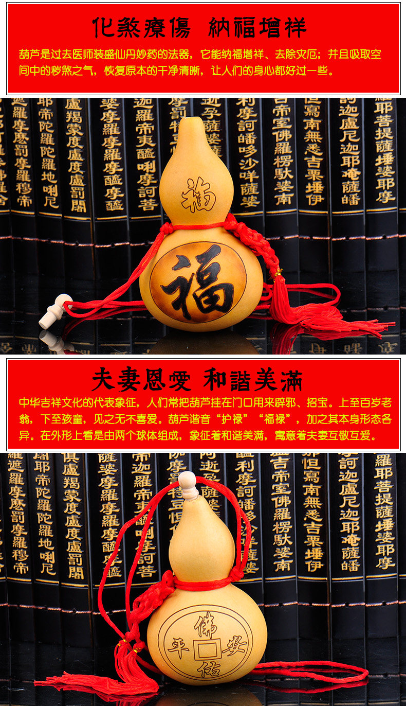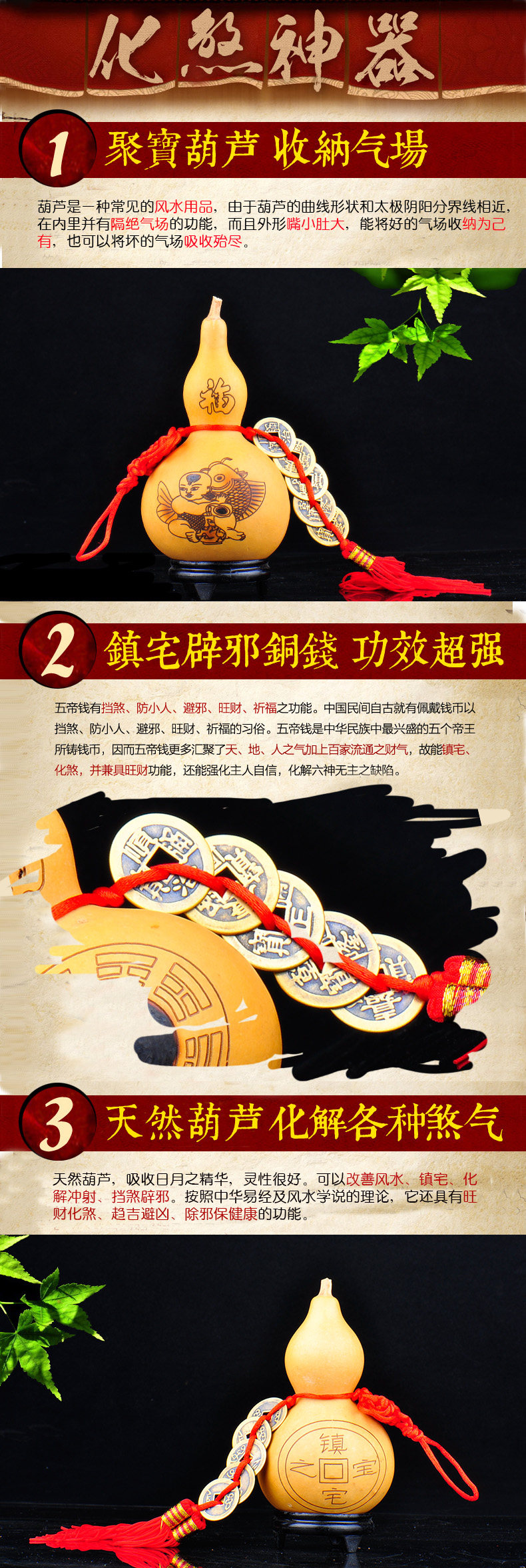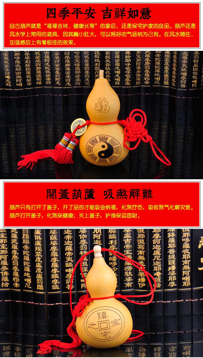 Mahogany, is the ancient Taoist wizards fell monsters instruments used for the flooding disaster. The role of mahogany gourd ancient unrecorded, but the evolution of today, Chuan Body meaning of security and peace. Put the bed at home insurable sleep; put in front of the toilet, you can drive six ghost; placed on top of the vehicle, security and peace; placed on the chest, it can be used as ornaments.