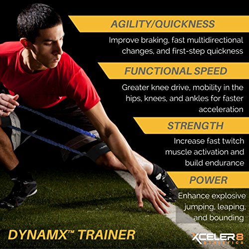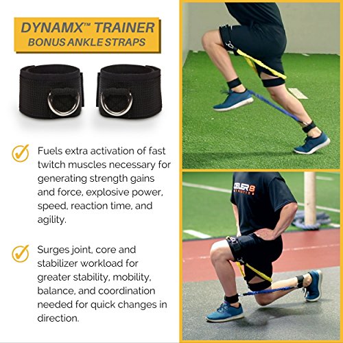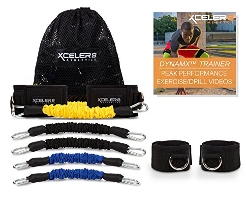 DYNAMX TRAINER | INCREASE YOUR SPEED, AGILITY, EXPLOSIVE POWER, STRENGTH, AND ENDURANCE FOR ALL SPORTS For every athlete to improve their performance?from vertical to a quick first-step?they must train their body in 5 key areas: Strength, Power, Speed, and the biggest contributors to sports performance?Speed, Agility, and Quickness. With this in mind, we designed the DYNAMX TRAINER: an easy to use resistance band set that can be incorporated in all areas of athletic training. The kit engages, strengthens, and conditions lower body fast twitch muscle fibers, increases core workload, improves joint stability and mobility throughout large ranges of motion (fueling advances in sports movements, such as leaping, acceleration, deceleration, coordination, balance, stability, and lateral quickness). THE DYNAMX TRAINER Resistance Band Set Features: - Comfortable and durable thigh straps, 3 sets of 10, 20 and 30 lbs. bands; providing resistance levels up to 120 lbs. to combat performance plateaus.