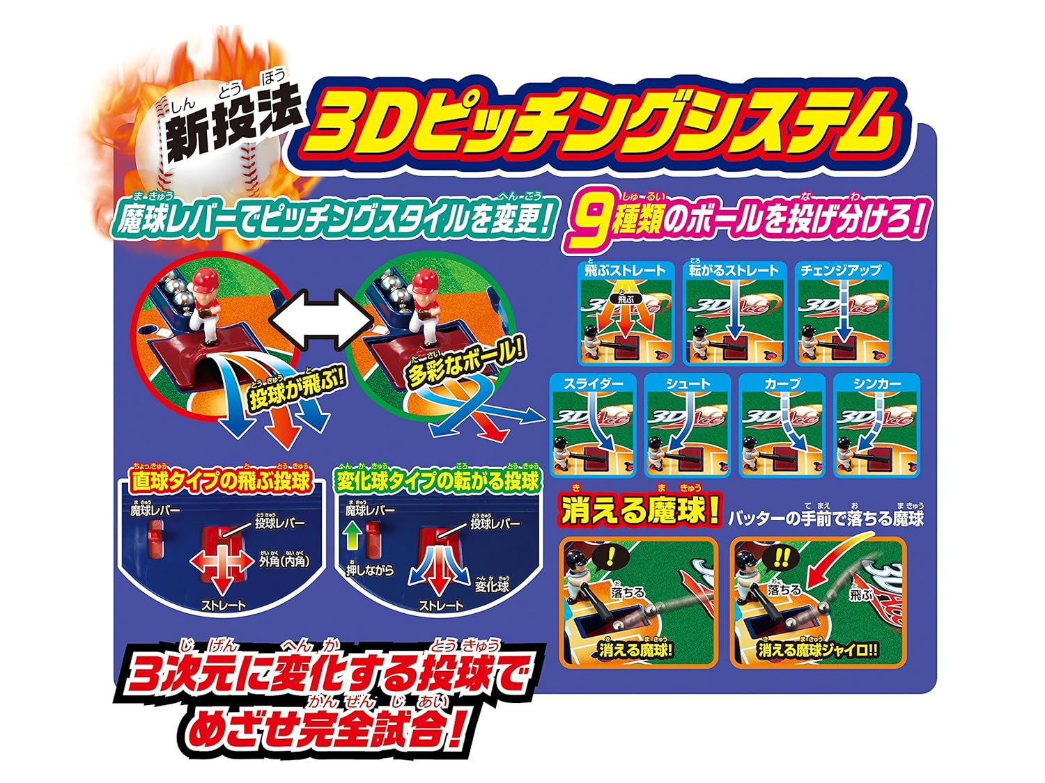 ボールが宙を飛ぶ3Dピッチング機能搭載! 2D・3Dピッチングで合計9種類の