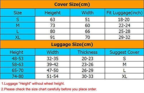 Fit quickly and easily in seconds. Durable and washable, 4 sizes available to fit almost any luggage. S: fit 18-20 inch luggage, M: fit 22-24 inch luggage, L: fit 25-28 inch luggage, XL: fit 29-32 inch luggage.