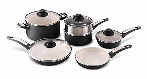 Studio : GreenPan Publisher : GreenPan Binding : Kitchen Product Description The GreenPan Focus range is designed for a trendy kitchen without compromise. The aluminum 10pc Ceramic Non-Stick Cookware Set with a black exterior body, combined with the cream Thermolon ceramic non-stick coating is a favorite amongst foodies and design addicts. But let's not judge the collection by its color, because the Focus range has a lot more in store. It is dishwasher safe and extra convenient thanks to the stay-cool Bakelite handle and glass lid. Complete with a limited lifetime warranty for worry-free cooking. In short: a trendy and healthy companion in any kitchen! This set includes: 8” open frypan, 10” covered frypan, 1qt conical covered frypan, 2qt covered saucepan, 5qt covered casserole, and stainless steel multi steamer insert. 0