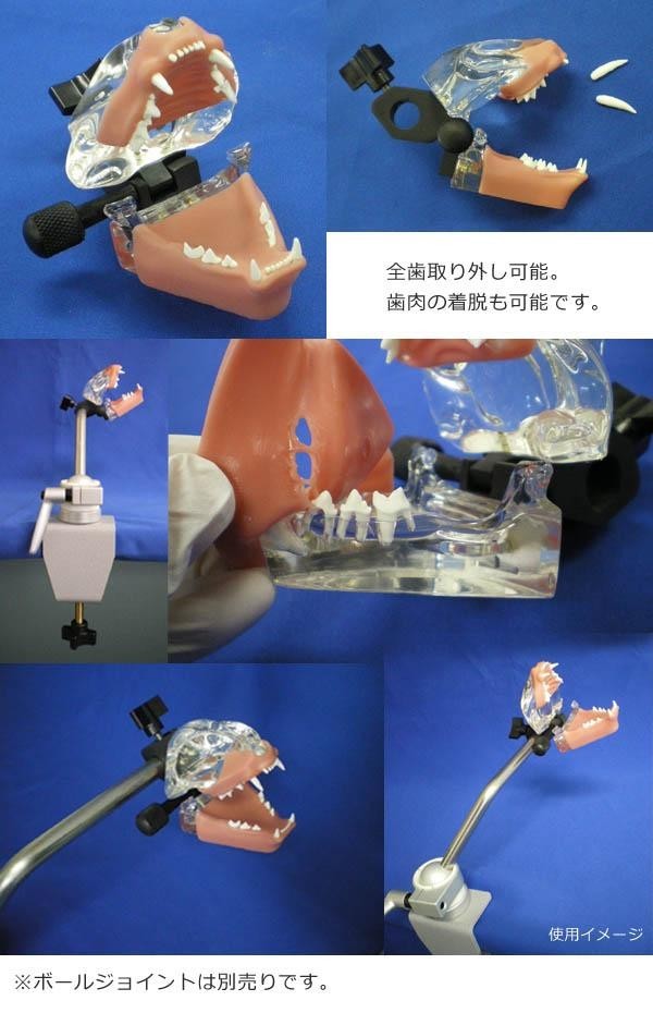 fk094igrjs実習の際の歯牙の研磨・切断等が可能な、猫の透明顎実習模型です。全歯取り外し可能で、歯肉の着脱も可能です。模型歯牙は実際の歯牙の硬さに可能な限り近づけた、合成樹脂を使用。クリアな樹脂素材を使用した模型顎部分は、歯根部分まで目視でき、スケーリング時の歯周ポケットでのキュレットの動き等も確認できます。別売りのボールジョイントと併用することで、実習・説明がより行いやすくなり便利です。