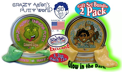 -. Feature : Crazy Aaron's Thinking Putty "Lizard Lips" & "Scorpion Skin" Gift Set - 2 Pack / Made in the USA of non-toxic silicone, never dries out & is easily removed from solid surfaces. - Gluten free, latex free and amazing for special needs, therapy, fun & so much more! / For Ages 3 and up - Fun for the whole family! - Makes a great gift! / "Lizard Lips" Heat Sensitive Hypercolor Changes From "Cool" Emerald Green to "Hot" Peach! Heat Sensitive Hypercolors really make their mark! Hypercolor Thinking Putty is thermochromic -- just a touch from your hands or a warm coffee mug will reveal a new "hot" color. / "Scorpion Skin" Glow In The Dark Putty Changes From A Creamy Amber Color to Bright Green! Charge with sunlight or our Blacklight Keychain for fantastic brightness!