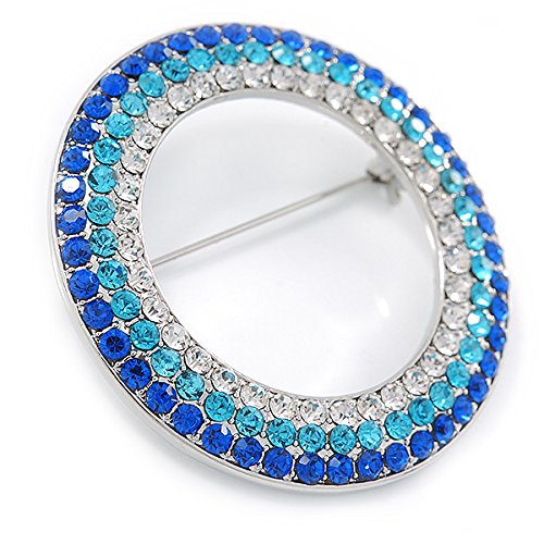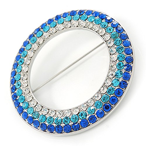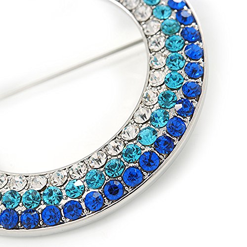 Jazz up your look with this stunning Blue/ Aqua/ Clear Austrian Crystal Open Cut Circle Brooch In Rhodium Plating. Featuring an open cut circle design, crafted in rhodium plated metal and pave set with blue, aqua and clear crystals. The brooch measures about 50mm in diameter, and fastens with a flag pin and revolver. It's the perfect way to dress up your outfit if you're going out for the night.Feature
