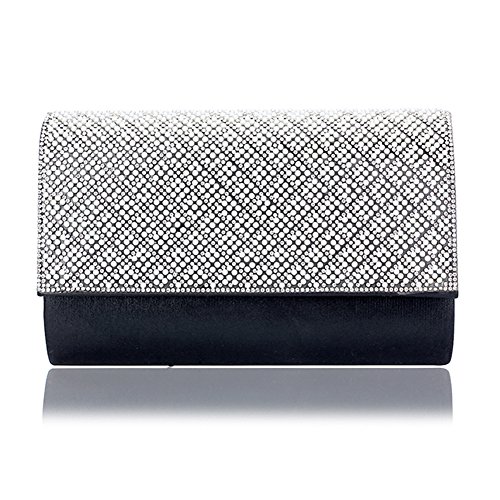 -. Feature : Elegant shinny fabric clutch evening bag with sparkling diamonds & pearl beads / Polyester lining. Magnetic-flap closure. Interior wall pocket. / This bag has the following dimensions : 8.5 in (L) X 1.8 in (W) X 6in (H) / Clutch by hand, tote or crossbody bag use,with 22"in removable silver-tone chain. / Perfect for night out, date, cocktail party, family reunion, prom, banquet and so on