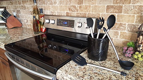 -. Feature : Premium 5 piece kitchen utensils set with professional grade stainless steel handles and durable silicone heads. Will not melt or burn like other utensils. Silicone cooking heads to provide the most durable and heat resistant cooking utensils available. Hanging loops on each end easy storage - LIFETIME GUARANTEED / Intelligently designed with commercial grade quality and will not scratch non-stick cookware. Built to last a lifetime. Perfect kitchen tools for the professional chef or novice. Heat resistant up to 480 degrees. Will not melt like other rubber or plastic utensils. / FDA approved. BPA free. Latex free. Finally a design that perfectly integrates silicone with stainless steel. Beautiful contemporary finish. Will not scratch expensive nonstick cookware, baking pans or bakeware. Cleanup is fast and easy. Dishwasher safe. / Complete cookware set covers all kitchen needs including spaghetti server, serving spoon, spatula, slotted turner and soup ladle / The difference? Our kitchen utensil set combines durable silicone heads with thick stainless steel handles to provide the ultimate kitchen tools available with easy cleaning (dishwasher safe) and non-scratch silicone. Order now with peace of mind due to our Better Than Money Back LIFETIME GUARANTEE. No catches. No hassles. You're always protected.