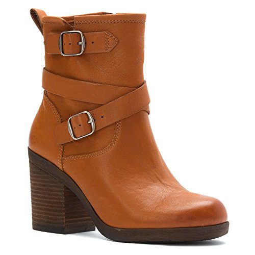 Ankle boot featuring crossing straps with antiqued hardware buckles and wood-look block heel