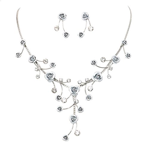 Silver tone fashion jewelry set with beautifully detailed flowers and clear, glass crystals