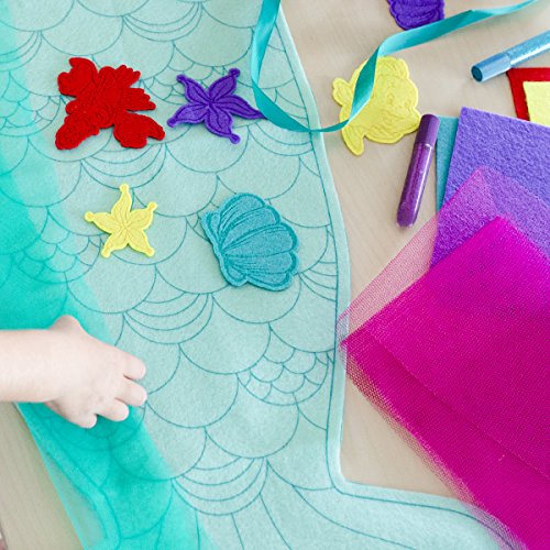 This all-in-one kit includes: Mermaid tail apron, aqua and purple tulle, felt shells and stars, felt Sebastian and Flounder characters, glitter glue, felt sheets, and instructions.